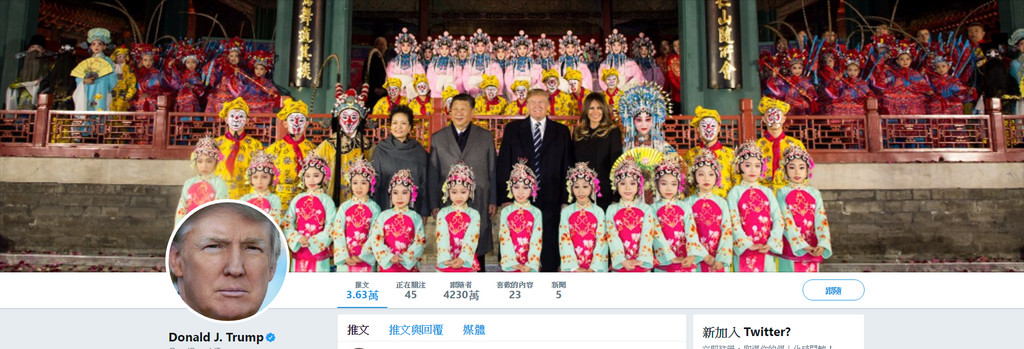 不僅如此,川普更將推特背景照換成與習近平夫婦的合照。照片中,川普夫婦和習近平夫婦微笑站在正中間,京劇表演者則分別站在前後左右,場面非常祥和,應是兩國元首在暢音閣觀看京劇時所拍攝的。