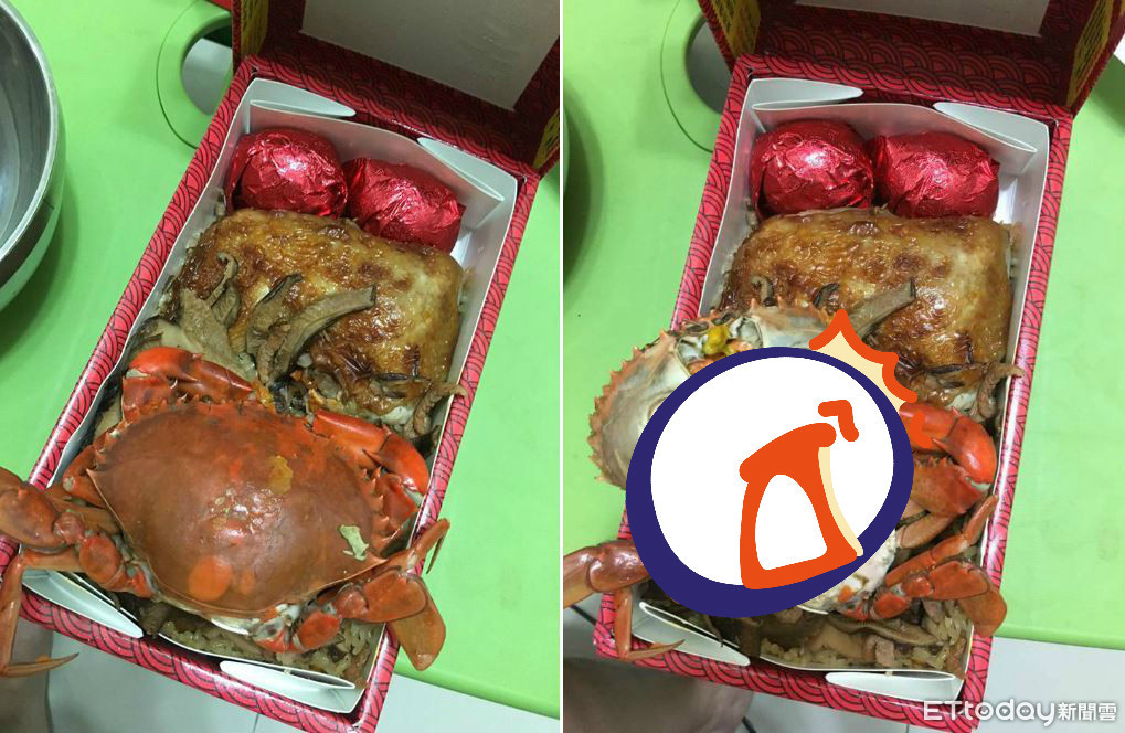 嘉義攝影師Benny Huang在臉書社團「爆廢公社」貼出一張照片,從畫面中可以看見,一盒超長禮盒中有隻幾乎占據半盒空間的紅蟳,還有一隻超大隻的雞腿以及2顆紅蛋,而原本是主角的「油飯」已被紅蟳壓在底下,只能從餘縫中看見些微的樣貌,瞬間從主角變成了配角。