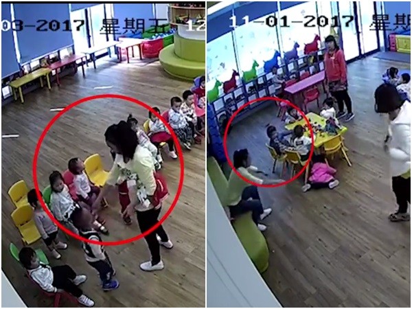 從網路上流傳的影片中可見,一名女職員不明原因將女童的書包搶走,狠狠摔到地上,再大力動手推她,害小女童跌倒撞到桌角。另一段影片則拍下,職員趁幫孩子換衣服時,將不明物品強塞進孩子口中,也不管孩子張嘴大哭。家長指控,不明物體就是芥末。還有一段影片,拍到女職員大力拉扯孩童的耳朵,將孩子拉到座位上。