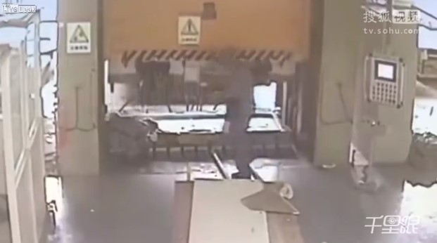 ▲操作液壓機的工人發現同事跪著被壓死,一開始還沒有反應過來。(圖/翻攝自LiveLeak/搜狐視頻)
