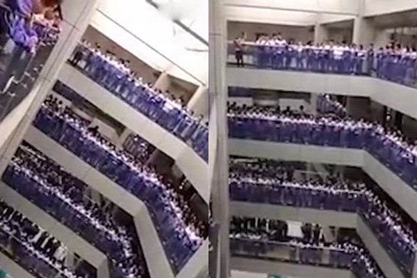 從影片中可以看到,上千名身穿紫色校服的高中生主動聚集在校舍內走廊,一同忘情地高唱林志炫的《單身情歌》,彷彿不吐不快,要將內心那壓抑的心情撕心裂肺地吼出來,場面相當震撼。