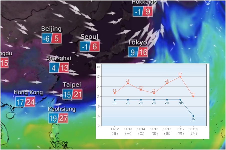 另外,觀氣象看天氣粉絲團也引述氣象局溫度趨勢圖表示,18日台北市測站有機會下探15、14度,也就是達到大陸冷氣團標準。但預計這波冷空氣預測19度才達到最強,有可能是第一波大陸冷氣團,且影響是全面性,各地都會感受到這波冷空氣的威力,至於溫度會下修到幾度仍待持續觀察。
