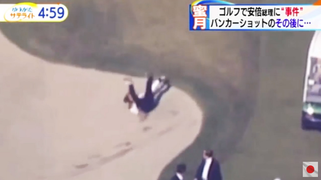 據「朝日新聞」報導,安倍和川普5日下午一起在2020年東京奧運比賽用地「霞關鄉村俱樂部」(霞ヶ関カンツリー倶楽部)打高爾夫球,不過安倍在揮杆成功後,離開沙坑時沒有踩穩,整個人翻滾摔落,川普當時因為朝著另一個方向離開,所以沒有親眼目擊慘跌景象。