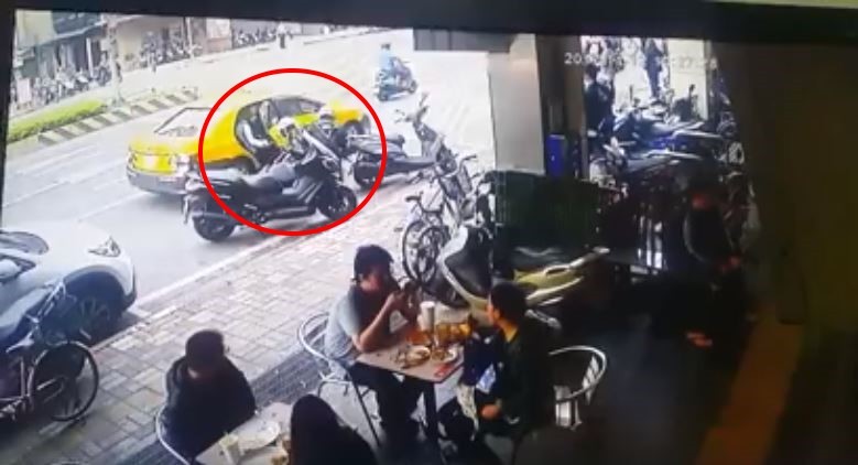 這時,一名機車騎士從畫面左側緩慢切入,但其他騎士看到這輛計程車都是往左側閃,該名騎士卻是鑽進右側的窄縫,而車上後座的女乘客彷彿是「算準時機」般突然打開車門,導致騎士被撞到重心不穩,當場摔倒在人行道旁,碰撞的聲響也讓正在用餐的客人紛紛回頭查看。