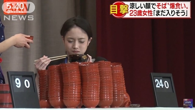 「全日本一口蕎麥麵錦標賽」已經來到第32屆,此次的參賽者中,除了四連霸的大叔井本英明以外,最令人注目的,就是首次參賽的小原尚子,她的外型苗條,完全不像會來參加大胃王比賽的人,但卻在比賽一開始就發揮驚人「食力」,輕鬆飆破200碗,佔據領先位置。