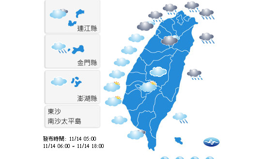 中央氣象局表示,昨(13)日在東北風與南方雲系的影響之下,各地都有降雨的情況發生,在溫度部分,北台灣白天高溫約23至25度,其他地區則是26到30度;今(14)日則仍受到東北風影響,迎風面的北部及東半部地區仍然是容易下雨的天氣,白天高溫也大約落在22至25度之間。