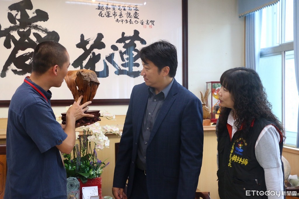 ▲「河北收藏家‧根雕專委會」會長劉平拜訪花蓮市長魏嘉賢,感謝市公所對「2017國際BCI盆栽賞石展暨海峽兩岸藝術文化交流展」的協助,並致贈崖柏雕飾作為紀念。(圖/花蓮市公所提供 下同)