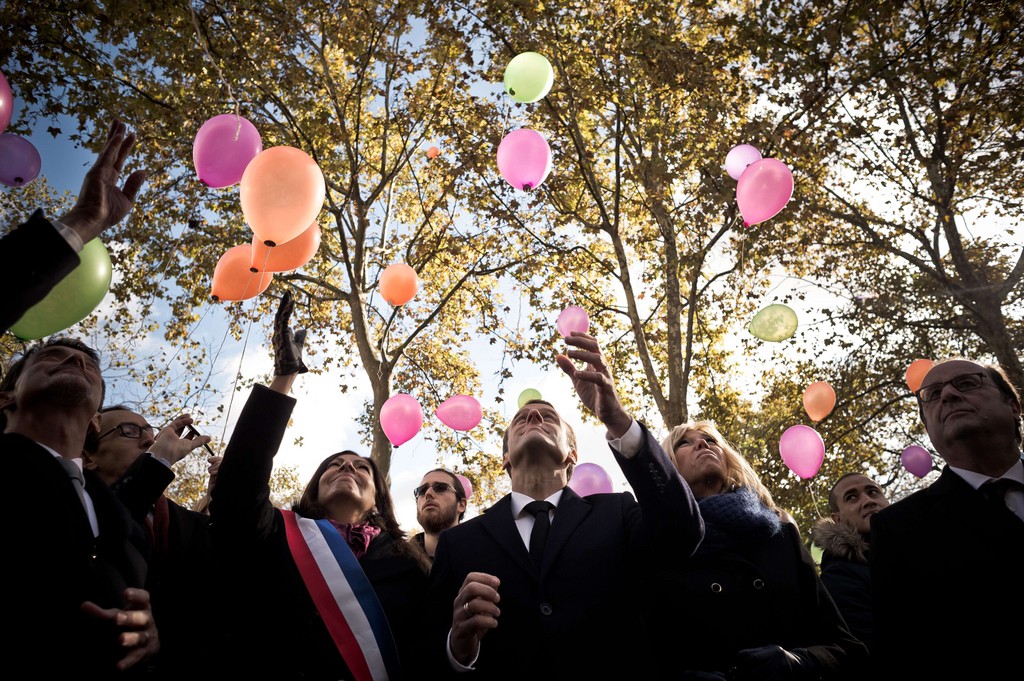 法國巴黎連環恐攻至今已過了兩年,當地民間團體13日舉行紀念活動,總統馬克宏與夫人布莉姬也到場致意並慰問罹難者家屬。馬克宏夫婦前往法蘭西體育場、位於巴黎10區和11區一帶的許多餐廳、小酒館以及巴塔克蘭劇院(Bataclan)等當年的恐攻地點,也與眾人一起釋放彩色氣球,場面令人動容。法國前總統歐蘭德、巴黎市長伊達爾戈(Anne Hidalgo)等人也參加了這場紀念活動。