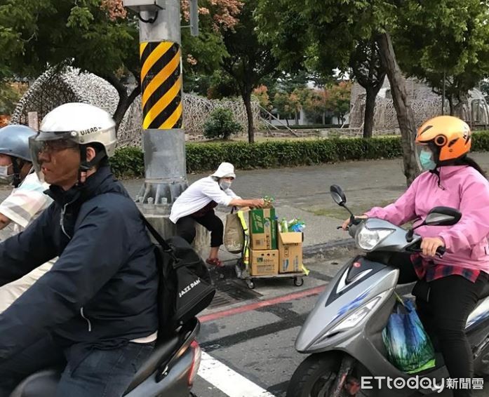 廖姓女網友在臉書社團「爆廢公社」PO出一張照片,從畫面中可以看見,一名頭戴漁夫帽、臉帶口罩的阿嬤靠坐在電線桿邊緣,兩隻腳還得撐在地板以防身體掉落,她前方拉著滿是飲料紙箱的推車,一旁全是正在趕路的機車族,而她卻是默默等待客人上來,畫面相當衝突。
