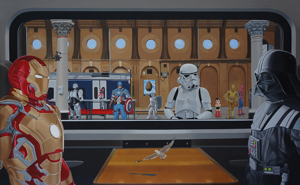 像《不曾興建卻真實存在》,描繪星際大戰的白兵與本田的人型機器人Asimo,坐在某項交通工具的觀景窗前,映入眼簾的風景則挪用文藝復興時期畫家老彼得‧布勒哲爾(Pieter Bruegel the Elder)所畫的《巴別塔》。