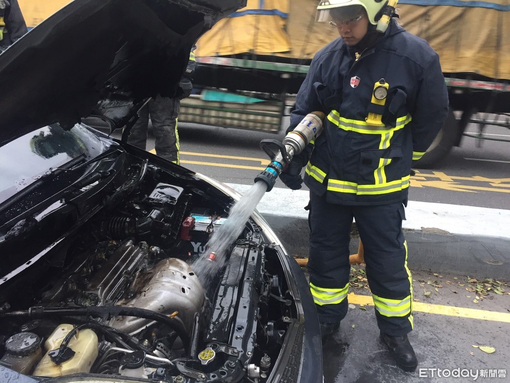 ▼警消初判是汽車裝飾板掉落引擎引發火勢。(圖/記者陳豐德翻攝)