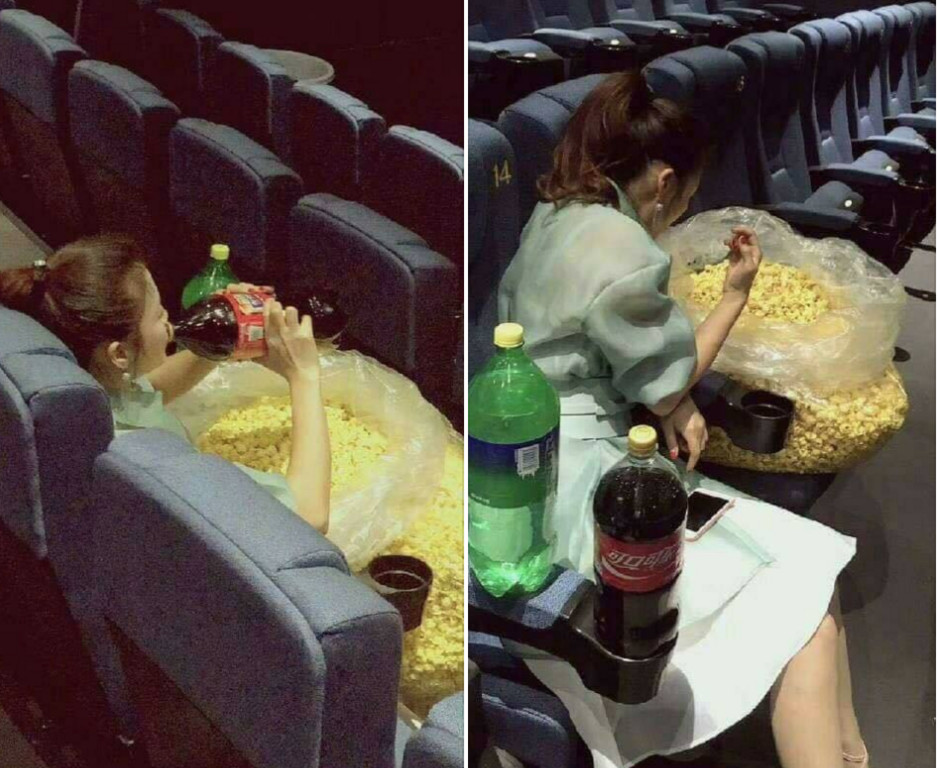 照片中,女子獨自一人入鏡,用販賣部常用來裝爆米花的袋子,裝ㄧ大袋爆米花吃,手拿超大罐可樂及雪碧,準備等待電影開播。