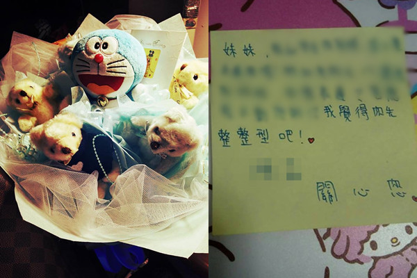 有男網友在臉書貼出照片,稱就讀國中的外甥女近日送娃娃給暗戀的男生,結果卻收到一張女同學傳來的恐嚇紙條,嗆聲要她「先整整形」。男網友擔心外甥女被霸凌,把紙條內容PO上網,想請教網友看法,結果立刻掀起熱議。