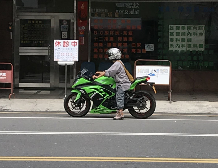 出家人也會騎重機?有網友在南投埔里街頭目擊,疑似一名身穿灰色袈裟的出家人,卻騎著一輛綠色Kawasaki重機,相當時髦。有網友留言開玩笑說,這位該不會是法號「海放」吧。