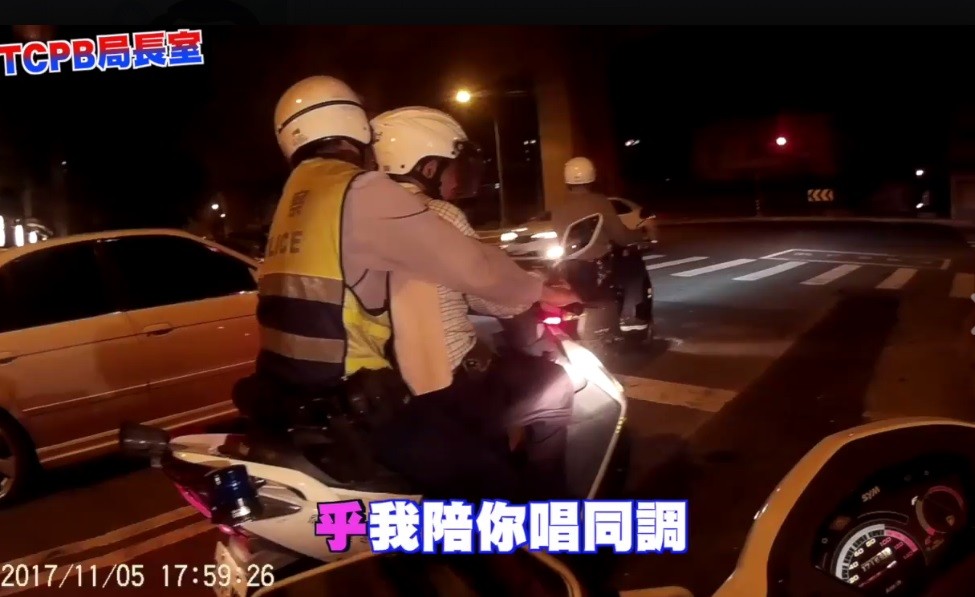 台中市警局第五分局北屯所警員歐彥成、蘇振榮、洪嘉成接獲報案,在軍功路旁發現一名失智老翁跌倒受傷,透過人臉辨識等方式查資料,老翁終於願意拿出皮夾,經由身分證查到住址,再請里長幫忙指路,要送他回家時,由於所內的汽車都已出去巡邏,於是讓老翁坐在機車前座,一路由員警平安護送到家。
