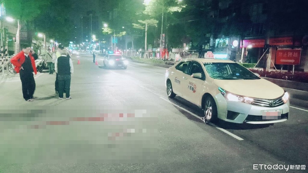 ▲警方詢問肇事的計程車司機案發經過,地面上滿是老翁血跡。(圖/記者陳豐德翻攝)