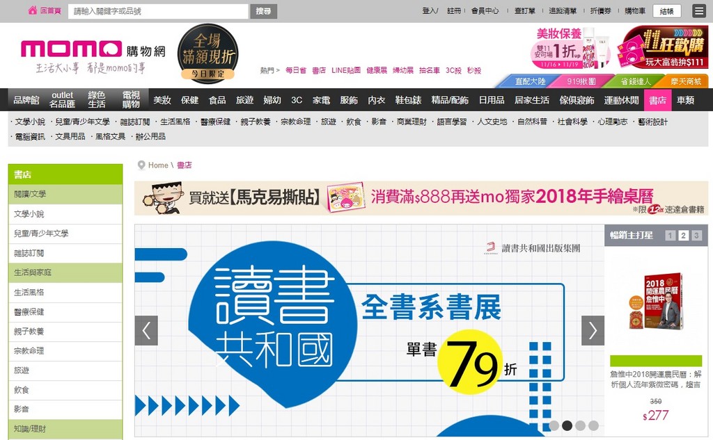 看準網路書市的熱絡,momo購物網於11月正式開設網路書店,攜手三民、基峯、圓神、采實、三采等約600家出版社合作,推出16大類別的書籍,涵蓋心理勵志、文學小說、生活風格、親子教養、醫療保健等各類別書籍外,暢銷書《教養的祕密》、《一戴深睡眠》、《做工的人》、《情緒勒索》等書籍也都能購入,預估至2019年上架書籍將成長10倍,未來也將提供電子書服務。