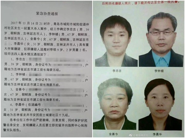 有網友在微博貼出當地警方發出的緊急通報,指稱14日晚間9時許在青島市城陽街道仲村社區發生重大命案,4名在逃的吉林籍朝鮮族人涉有重嫌,並提到他們逃走時還帶著2名分別9歲和2歲的男童。