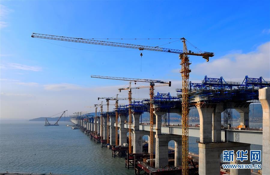 ▼工人在平潭海峽公鐵兩用大橋上加緊施工。