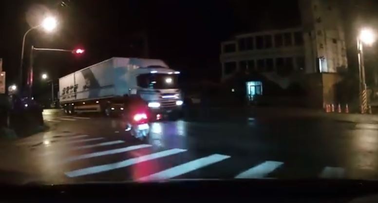 許多用路人都知道,路上遇到大車最好都要保持安全距離。不過,一名蕭姓網友日前在臉書「爆料公社」PO出一段13秒的行車紀錄器影片表示,深夜看到一輛貨運闖紅燈,還差點撞到兩台機車,實在很驚險。