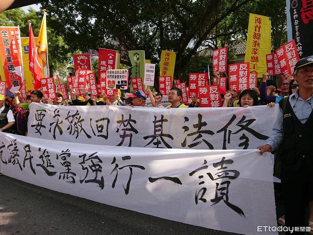 2017五一行動聯盟今天帶領全台數個工會團體,赴立法院大門口抗議,怒嗆政府要通過「全民過勞版」的《勞基法》修正草案,若立院修法通過,未來雇主可要求勞工連續工作12天,兩天間的輪班時間可剩8小時、30天內工作300小時、每個月加班54小時通通合法。