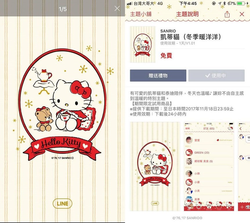 此外,只要在活動頁面上點選「贈送禮物」,LINE用戶就能將「凱蒂貓(冬季暖洋洋)」分享給LINE好友來下載。根據「主題小舖」的說明,這款主題下載時間至台灣時間11月28日23:59截止,使用效期也只有下載後24小時以內,用戶們立即下載體驗吧!