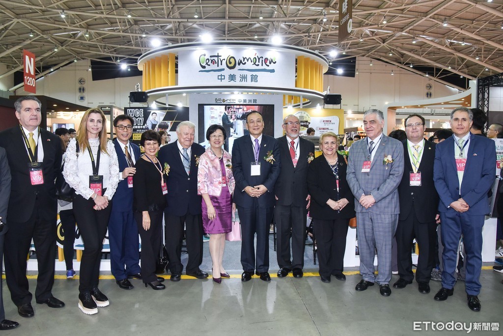 ▲外交部常務次長劉德立(左7)、中美洲經貿辦事處主任溫曜禎(左3)、瓜地馬拉駐華大使亞谷華Olga Maria Aguja Zuñiga(左4)、尼加拉瓜駐華大使達比亞William Tapia Alemán(左5)、薩爾瓦多駐華大使錢曾愛珠Marta Chang de Tsien(左6)、薩爾瓦多農牧部長Orestes Fredesman Ortez Andrade(右5)在咖啡展「中美洲館」前合影。(圖/記者李毓康攝,下同)