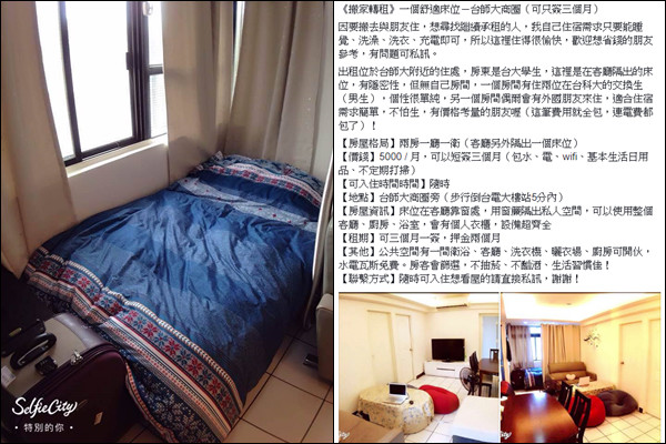 PO文的男子介紹,房東是台大學生,房屋格局雖是兩房一廳一衛,但要出租的是這個「從客廳隔出來的床位」,有個人衣櫃和「用窗簾隔出的私人空間」,月租5000元,包水包電包wifi,及所有基本生活日用品,還可以使用公共空間的衛浴、客廳、洗衣機、陽台,廚房也可開伙,「設備超齊全」。