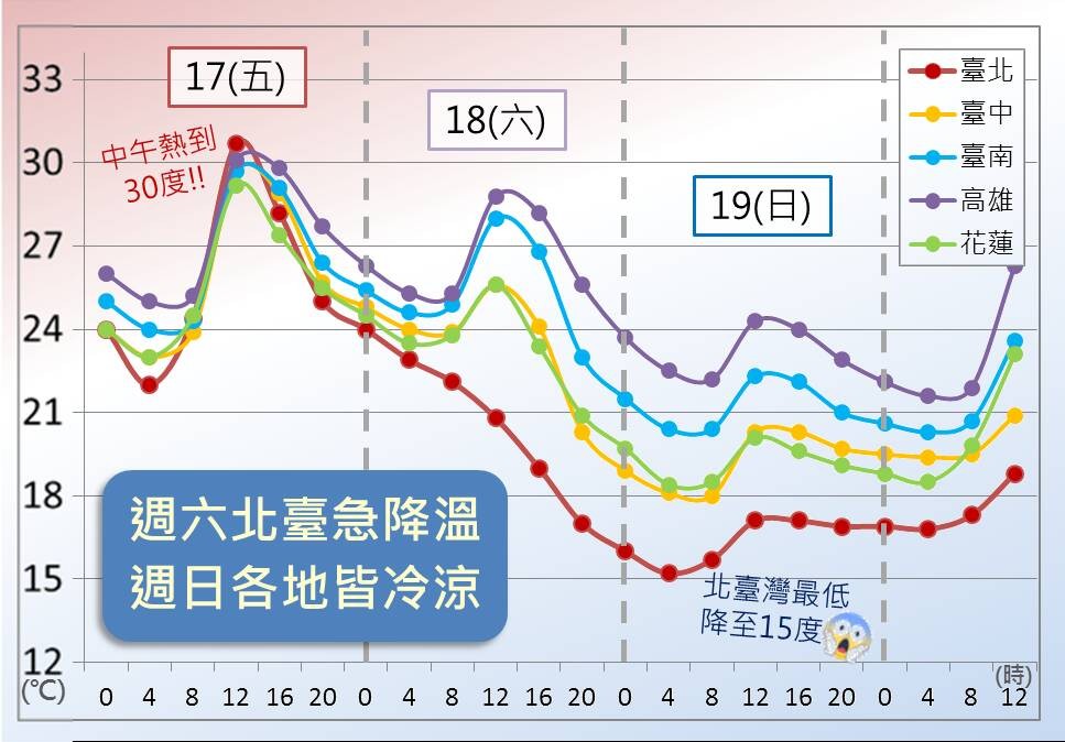 氣象局說,氣溫亦由北而南轉冷,清晨開始北台灣如同溜滑梯一般,中午左右氣溫僅剩21、22度,晚間至周日清晨更將下探15至17度;中南部及花東白天高溫雖然還能來到25至29度,午後也將明顯轉涼,深夜低溫來到20度以下。