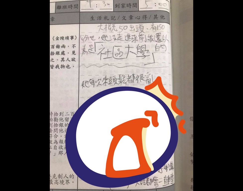 網友發文表示,兒子的導師這陣子請婚假,所以由代課老師代為上課,小日記也出了一道「英文代課老師」的題目。兒子的小日記寫道,「大概50出頭,有150公分吧,她沒走進來前,我還以為是『社區大學』的」,還在空白處畫上示意圖,並表示「她每次來頭『鬆』都很亂」、「有皺紋」、「口紅超紅」、「她的手每講一次話,都會一直轉」。而且網友還發現他寫錯字,把「頭髮」寫成「頭鬆」。