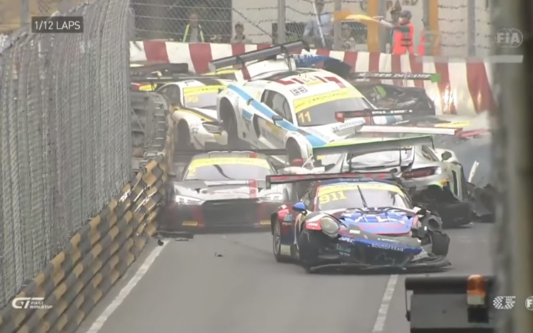 由國際汽車聯盟主辦的澳門GT盃賽事18日進行排位賽時,開賽第一圈就出現嚴重追撞車禍。50號車手真卡迪拿(Daniel Juncadella)過彎時角度沒抓好撞牆停止,後面第一部車避開,但後方其他車輛全都緊貼前車,加上該彎道屬盲灣,因此共12輛車全部煞車不及擠成一團。其中11號車手迪加拉斯(Lucas di Grassi)駕駛的Audi R8甚至被剷到其他跑車的車頂上,場面相當誇張。