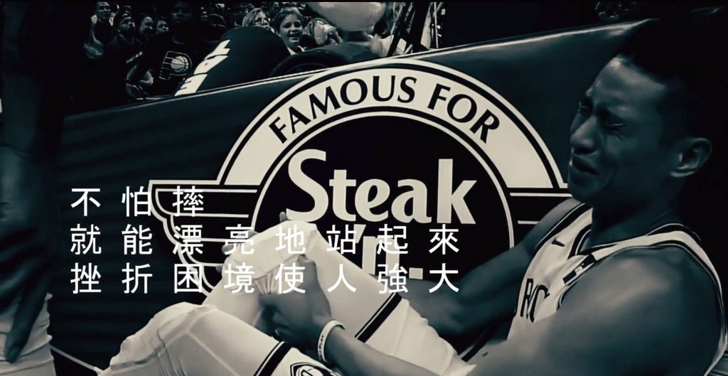 影片將林書豪對戰溜馬重摔落地、痛苦離場的畫面,結合衝浪篇的字幕「不怕摔,就能漂亮地站起來,挫折困境使人強大。」短短40秒影片洋蔥滿滿,台詞意外搭配,引發網友一致好評!