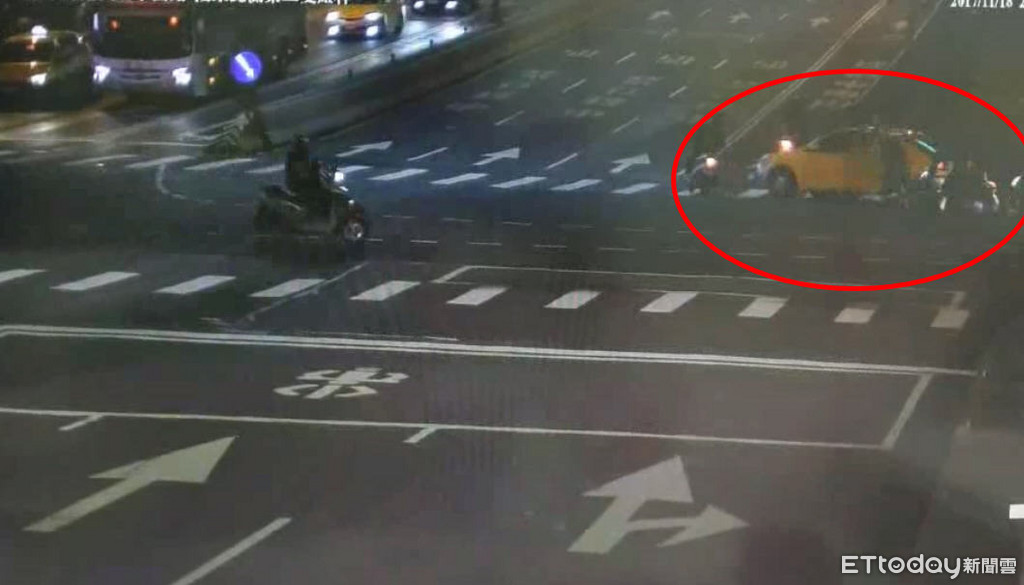 ▲監視器拍下計程車正要右轉,卻撞上一群機車騎士。(圖/記者楊佩琪翻攝)