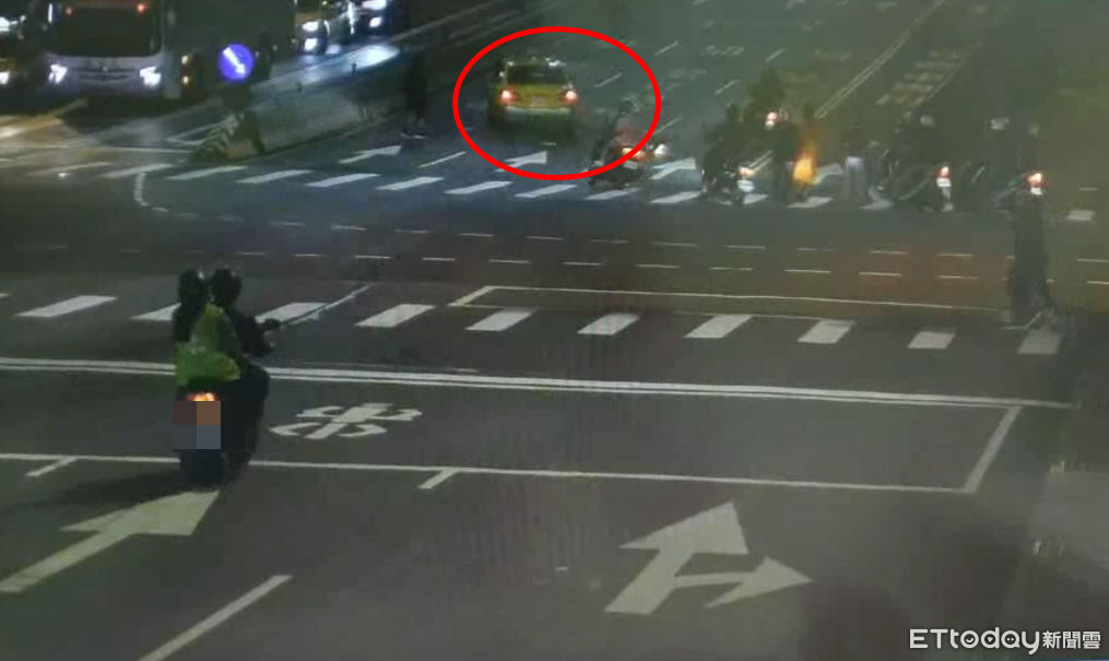 ▲監視器拍下計程車正要右轉,卻撞上一群機車騎士。(圖/記者楊佩琪翻攝)