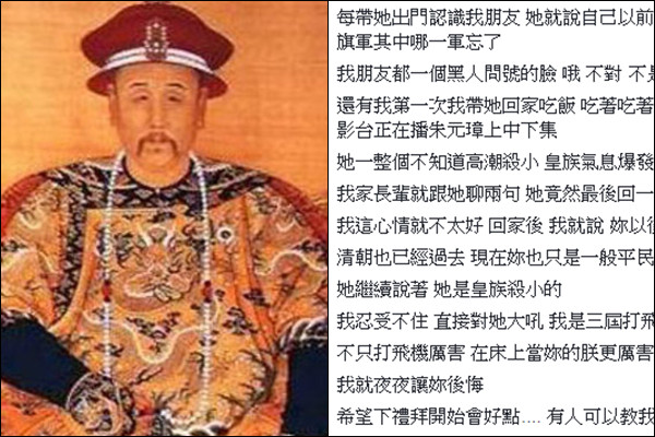 有一名男網友在臉書發文抱怨,稱女友整天炫耀自己是滿清皇族的後代,每次出門認識他朋友都要把祖宗的身家歷史搬出來講,還曾一度失控,脫口跟他家中長輩說「你們漢人都奴隸」,讓他受不了PO網求助,看有什麼辦法能讓女友改掉這種習慣,但網友的留言卻全都歪樓。