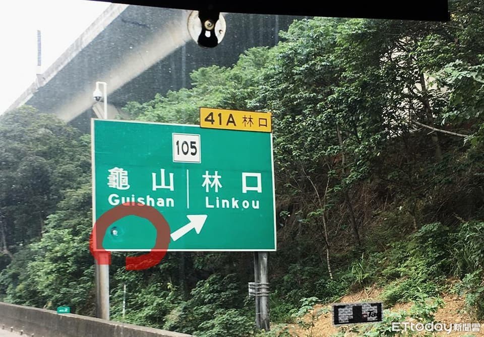 近日有網友在臉書社團瘋傳「南向林口A交流道前標誌牌面有安裝攝影鏡頭」,指稱標誌牌龜山字樣的龜字下方圓孔已加裝監視器,違規一次罰4000元,引發不少民眾熱議。國道警方收到圖片後到實地探查,發現照片地點位於南向40.2K處,林口A南交流道出口前,經檢視確認龜字下方並無洞口,也沒有安裝攝影機,確認網路流傳的照片為修圖造假。