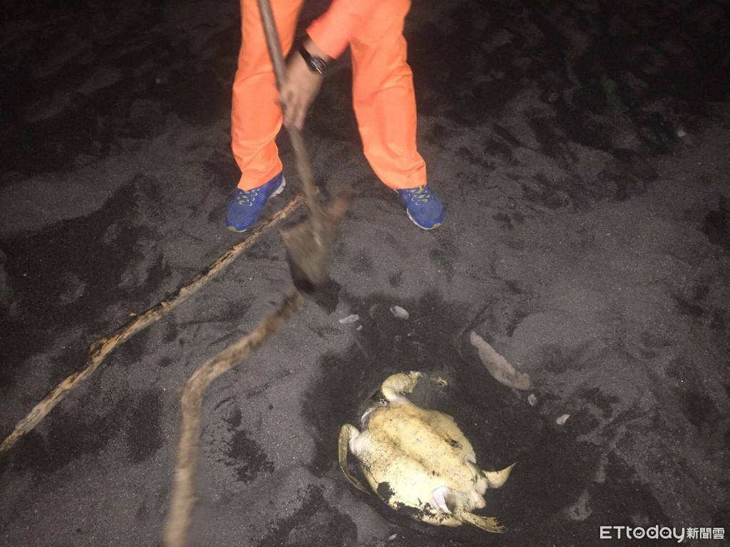 台東縣成功鎮白守蓮岸際沙灘19日下午發現一隻死亡綠蠵龜,海龜身長約40公分、寬約35公分,已死亡無研究價值,海巡人員就地掩埋。