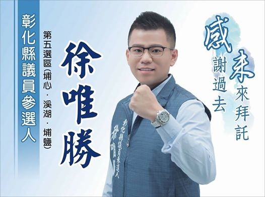現年28歲的徐唯勝擔任埔心青工會會長,日前宣布參選下屆縣議員,最近也勤跑基層,臉書也掛上宣傳照,臉書最後一篇留言停在11月9日,寫道「參選人,本就要有被放大檢視的義務,事情可能你我看的角度不同所以有了認知分歧,但經過解釋後,才發現原來都誤會彼此,特別是在臉書廣泛使用的現今,很容易因為文字造成誤會」。
