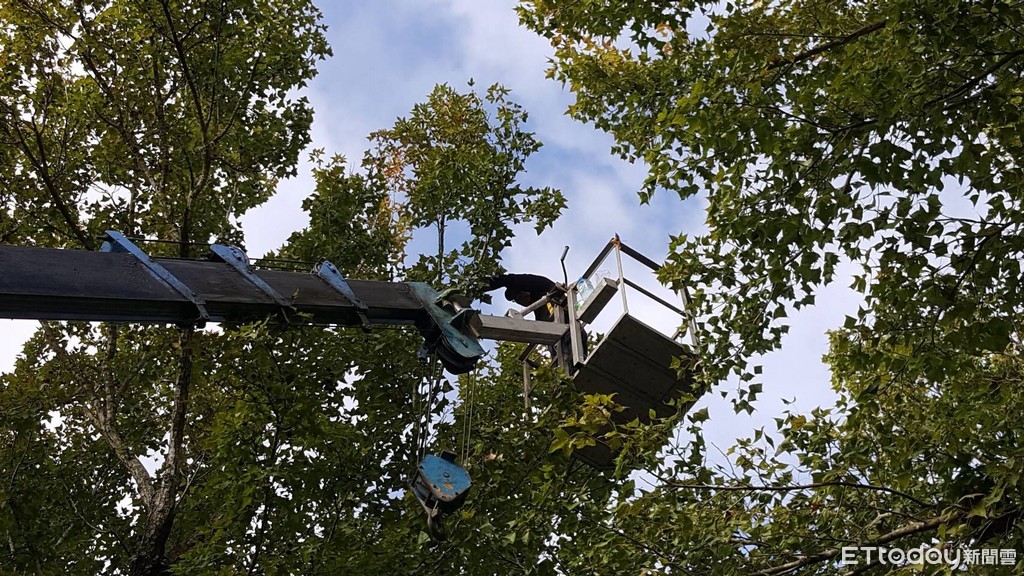 ▲台東關山高工商校園內有3株結實累累的楓香,樹高逾10公尺,無法攀爬,需動用重機具才能安全採集果實,台東林管處關山工作站日前完成採種任務,填補今年楓香育種數量的不足。(圖/台東林管處提供 下同)