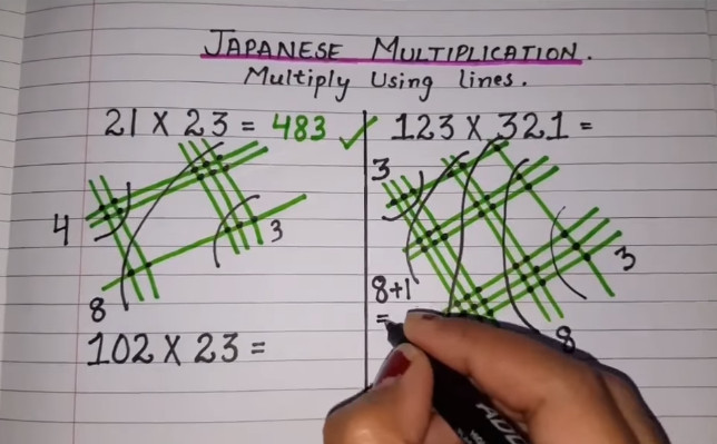 你的數學乘法很好嗎?最近臉書粉絲頁「Did you know?」分享一段日本數學乘法算數影片,利用線條計算交叉點數量,就能輕鬆簡單得到乘法答案。該影片在12日上傳分享,超過9700萬人次瀏覽。