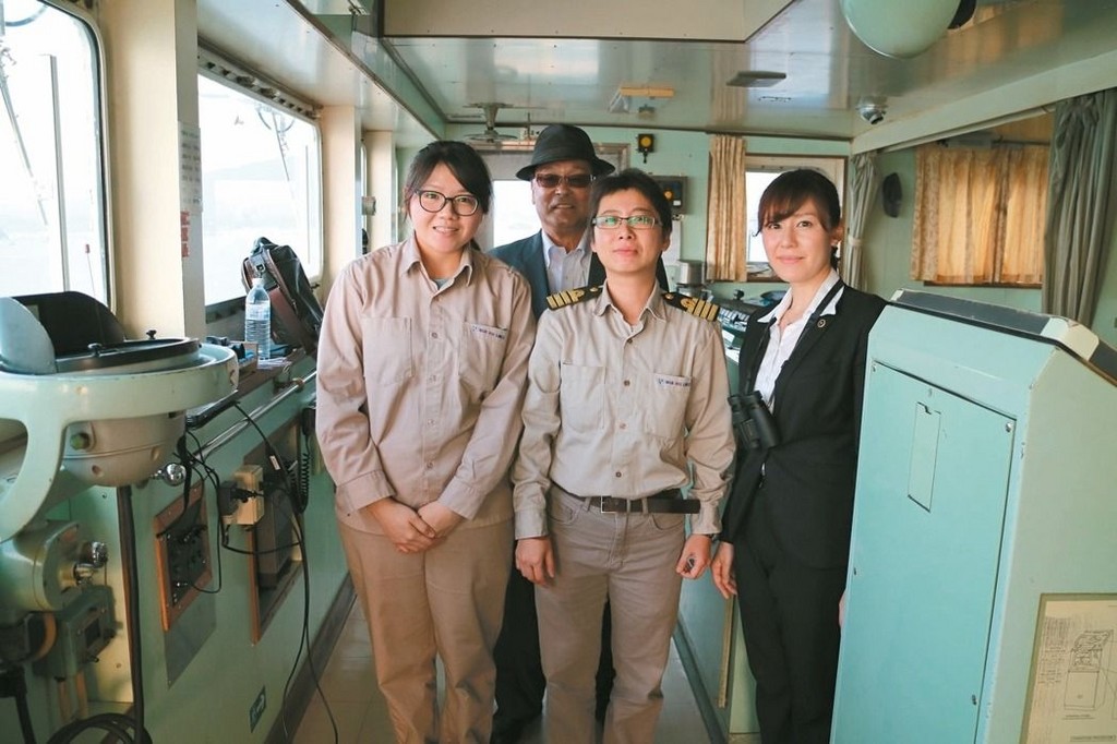 ▲台灣第一位女性領港人黃昭玲(中),右為日本女領港,左為海大商船系實習生,後為日本男領港。(圖/海洋大學提供)