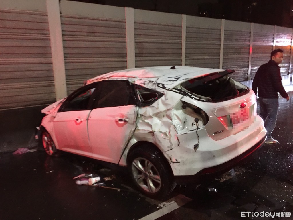 警方調查,23歲的蔡姓男子20日晚間駕駛白色休旅車,並搭載另4名友人,準備到台北市訪友,途中行經新北市新莊區台一線高架路段往北方向,疑因天雨路滑失控,先衝撞下匝道處分隔島後,然後車身旋轉180度,再撞上隔音牆後才止住衝勢。