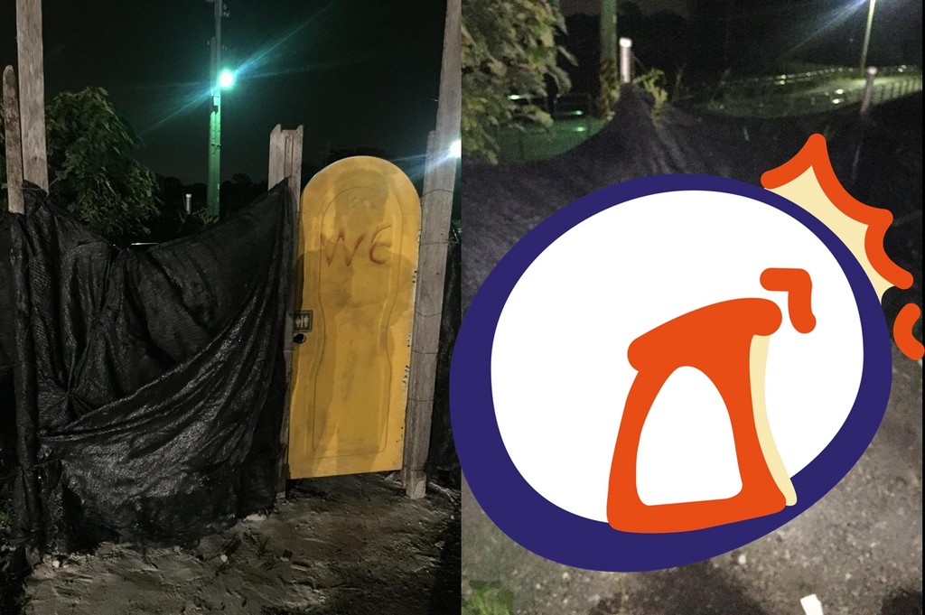 照片顯示,這間廁所位在夜市的側邊陰暗處,以路燈當作照明、也沒有牆壁和屋頂,只有一道寫有「WC」字樣的簡陋黃門以及黑布簡單圍著,走進這間「露天」廁所後、只見一片空地,地上還有許多黑色不明物體,且這道門還不能上鎖,因為門鎖的地方是中空的。據原PO表示,這是他第一次逛這家夜市,沒想到意外巧遇「最猛夜市廁所」。