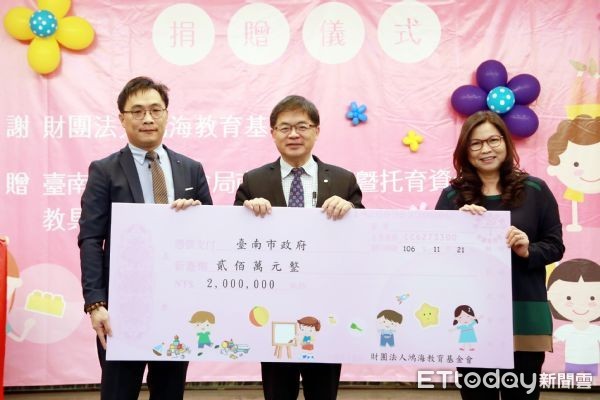 為提供更優質的親子互動與共學空間,台南市政府於部分地區開辦公私協力托育資源中心及大型親子館,為支持市府推動兒童托育服務,財團法人鴻海教育基金會,特別捐贈市值200萬元的兒教玩具,給南瀛親子館及仁德托育資源中心,21日於民治市政中心舉行捐贈儀式。