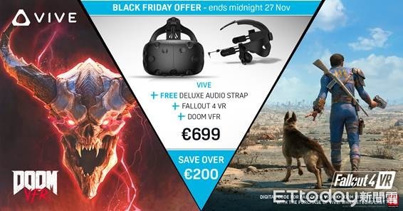 宏達電宣布拿下由經濟部工業局舉辦評選的2017年台灣第12大國際品牌,而在歐洲,HTC VIVE也宣布推出黑色星期五限時優惠,消費者只需以英鎊599元購入Vive,即可免費獲得Vive專屬頭戴式耳機及兩款由Bethesda所推出的3A級遊戲大作《異塵餘生 4 VR》及《毀滅戰士 VFR》的遊戲兌換代碼。不僅如此,玩家還可以獲得由Google開發的《 Tilt Brush 》與一個月免費試用Viveport 虛擬實境內容訂閱服務。