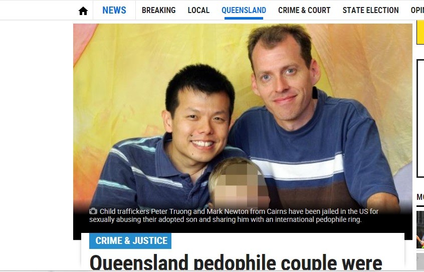 澳洲昆士蘭省凱恩斯(Cairns)一對男同志情侶領養了一名俄羅斯男童,但是他們不但自己性侵男童,更讓養子給其他戀童癖性侵,2012年分別被判處30與40年有期徒刑。近日更有新消息指出,他們曾打算在領養一名男童。