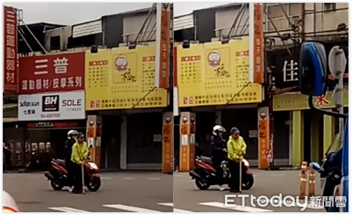 當天,陳小姐在經國路上等紅燈時,看到前方一位機車騎士,貼心護著老爺爺過馬路,她向記者表示,「如果你在現場,就會知道那條路有點長,因為我在比較後面,所以前面一大段被擋住,後面沒擋住的一段我才拍的」。