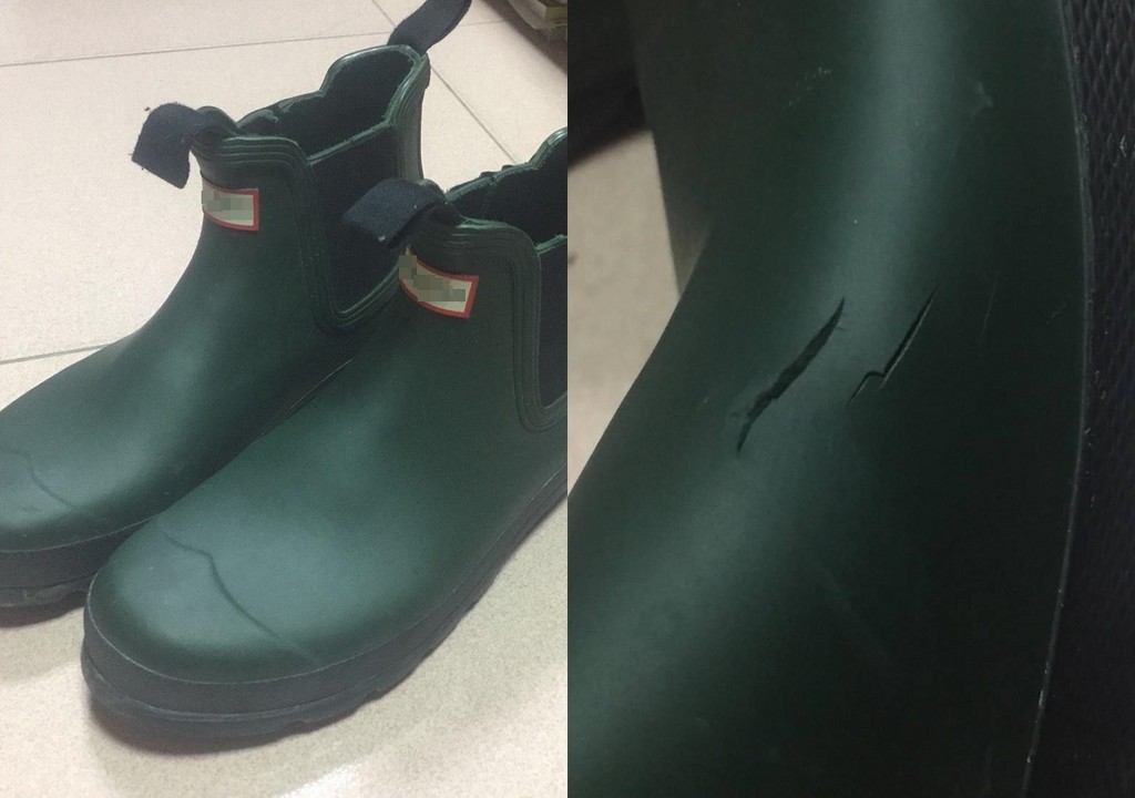 臉書社團「爆料公社」22日一名網友PO文抱怨說,自己2015年花了4680買一雙英國知名品牌雨鞋,使用了2年多之後出現龜裂情形,結果總公司要他自行去外面維修、原購買店家也說沒有維修服務。原PO憤怒說,業者根本在互相踢皮球,因此PO提醒大家別當下一位受害者,結果文章被網友紛紛嗆是奧客。