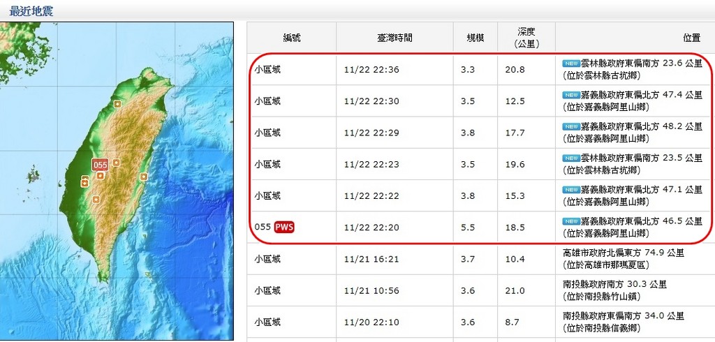 地震夜襲阿里山!22日晚間10時20分,嘉義縣阿里山鄉發生芮氏規模5.5地震,震央位於嘉義縣政府東偏北方46.5公里,震源深度達18.5公里,算是極淺層地震,中南部民眾皆有感,還有嘉義網友表示,此次地震就像921一樣,「先上下、再左右」。由於在10時20分震後,接連又在16分鐘內發生5起餘震,網友也嚇到爆粗口「X!又搖!」