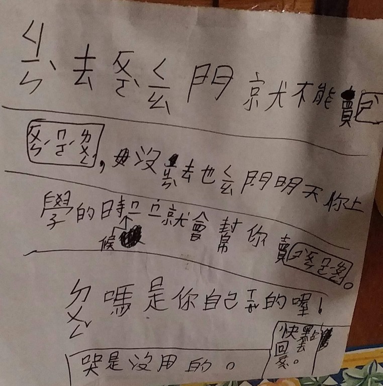 但是接下來的紙條有點悲傷,弟弟寫著「懂嗎?是你自己寫的喔!哭是沒用的。快點回去睡。」但自己卻忍不住坐在房門口啜泣,原PO哭笑不得的起床過來勸兒子、好不容易才把他哄回床上;她笑說,簡直像個「小宮女般嚶嚶啜泣」,這樣到底要算最低標準還是要發回重審?